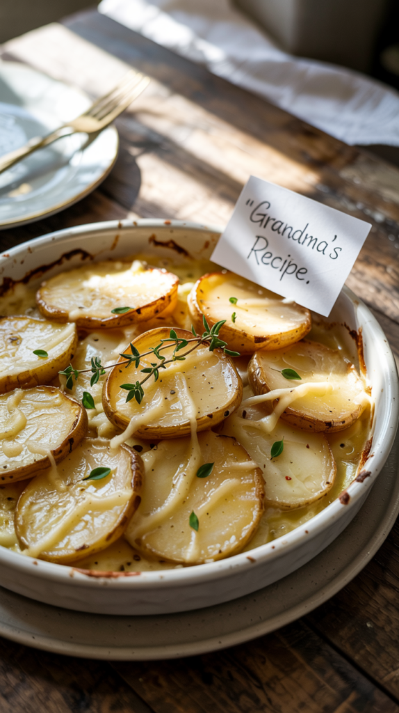 Layer the potatoes: Arrange half the sliced potatoes in the bottom of the baking dish. Pour half the cheese sauce over the top. Repeat with the remaining potatoes and sauce.