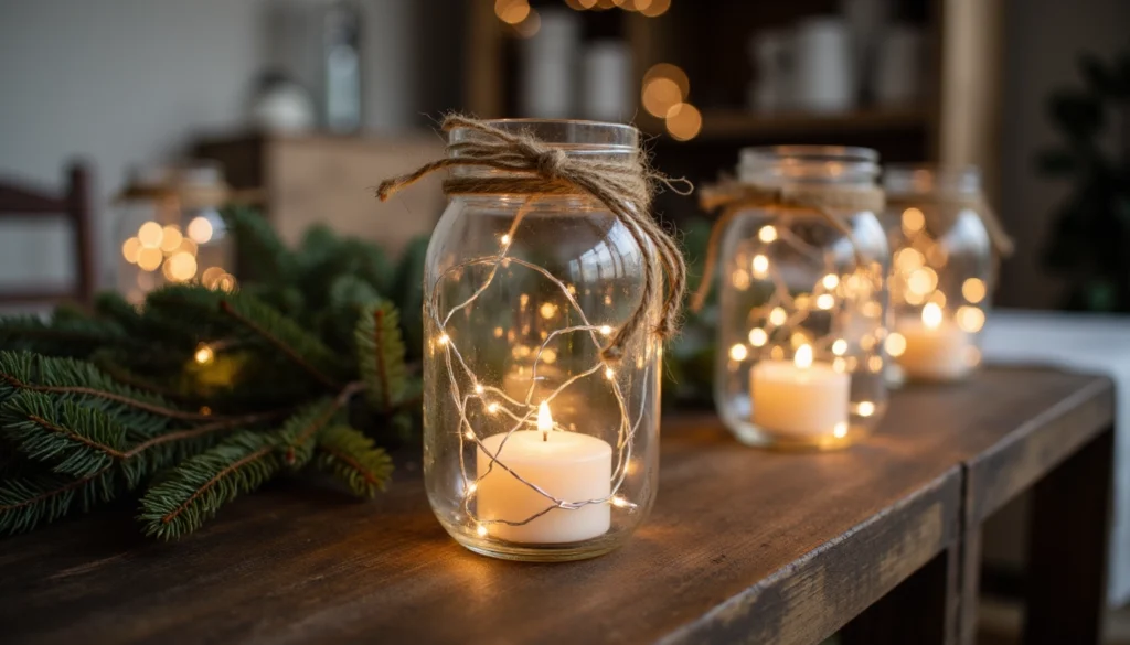 Turn old mason jars into beautiful lanterns with twine, burlap, and fairy lights. Fill the jars with faux snow or pinecones for a seasonal touch