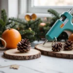 Use slices of wood, cinnamon sticks, or burlap to craft your own holiday ornaments. Add twine loops and a dusting of glitter for a magical farmhouse tree.