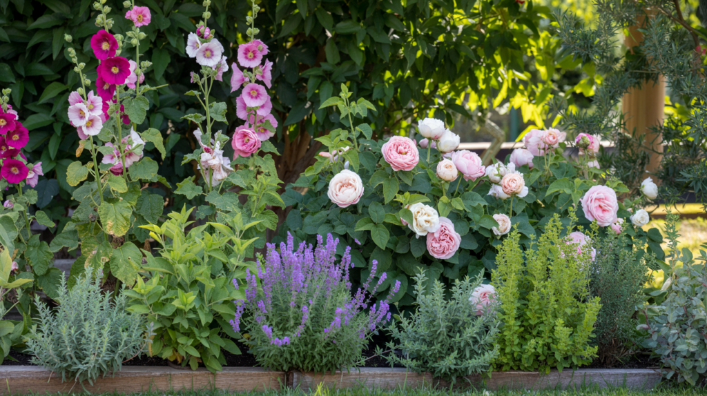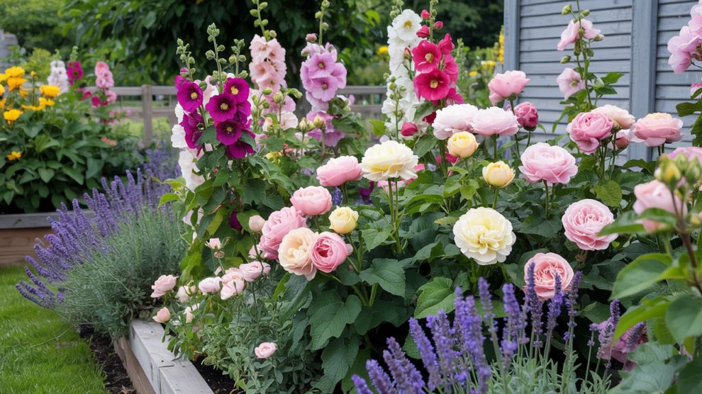- Tall (back): Delphinium, Hollyhocks