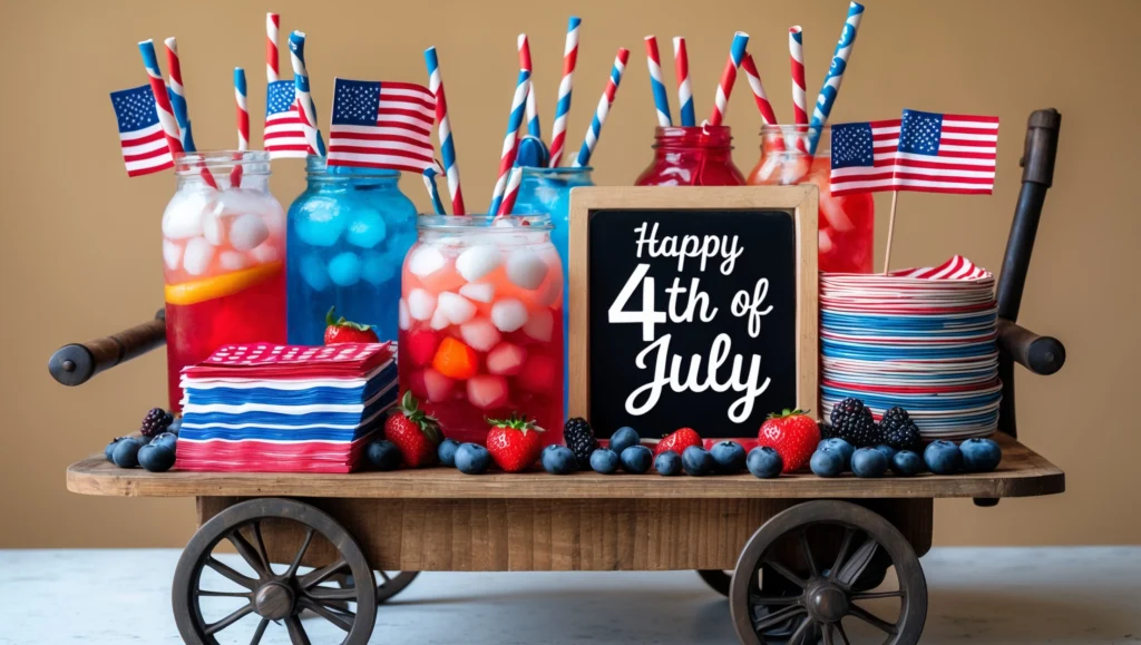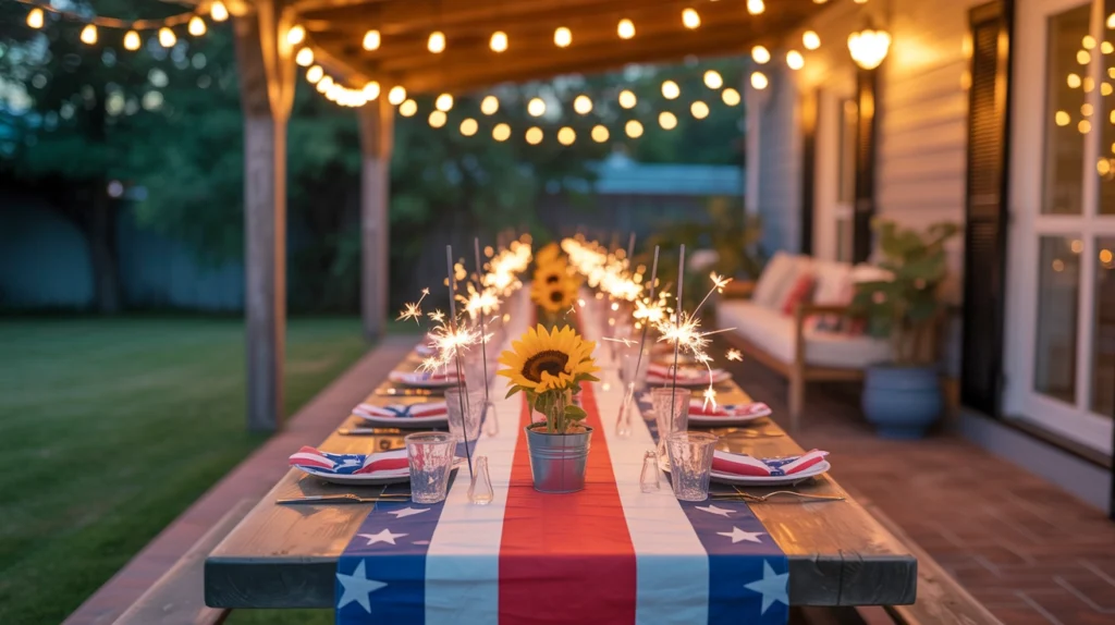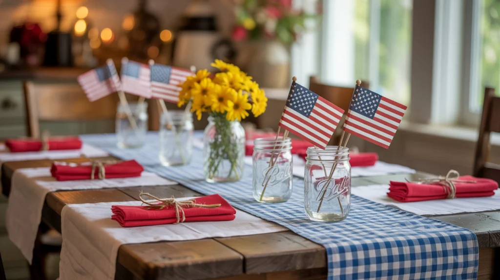 Create a festive table setting with layered textures and patriotic color palettes. Try a white tablecloth, denim or gingham runners, and red napkins tied with twine. Add mason jars filled with mini American flags, fresh daisies, or pinwheels for a casual yet classic look.