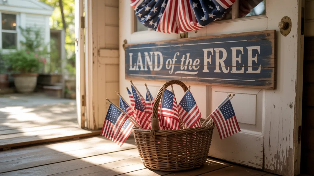 Welcome guests with front porch charm! Add bunting along the railings, stack crates or vintage coolers with potted petunias and mini flags, and hang a wreath wrapped in red, white, and blue ribbon.