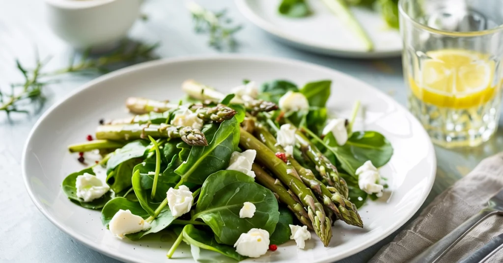 A refreshing Asparagus Salad with a medley of tender greens, crisp asparagus, creamy goat cheese, and a lemon vinaigrette — a bright and beautiful spring salad.
