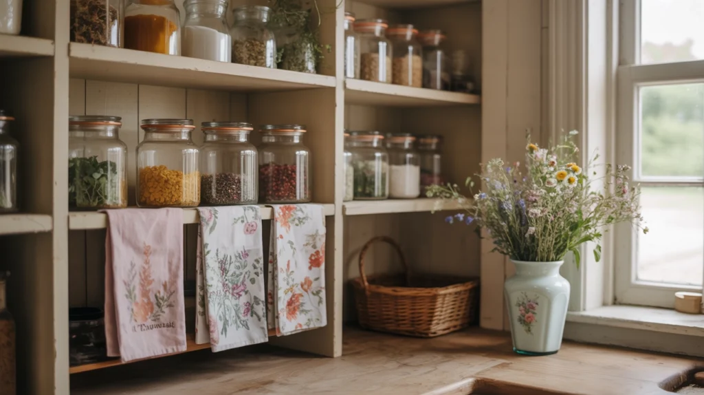 - Mason jars on open shelves filled with daisies, peonies, or wildflowers