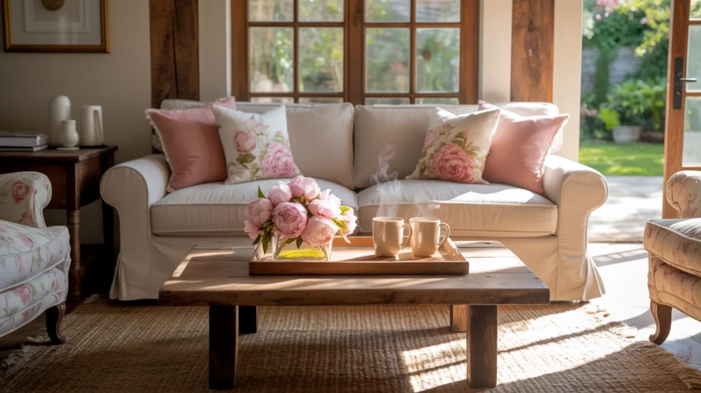 Slipcovered sofas, floral throw pillows, antique coffee tables, and a bouquet of hydrangeas on a vintage tray create a cozy, relaxed ambiance.